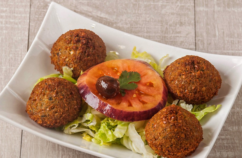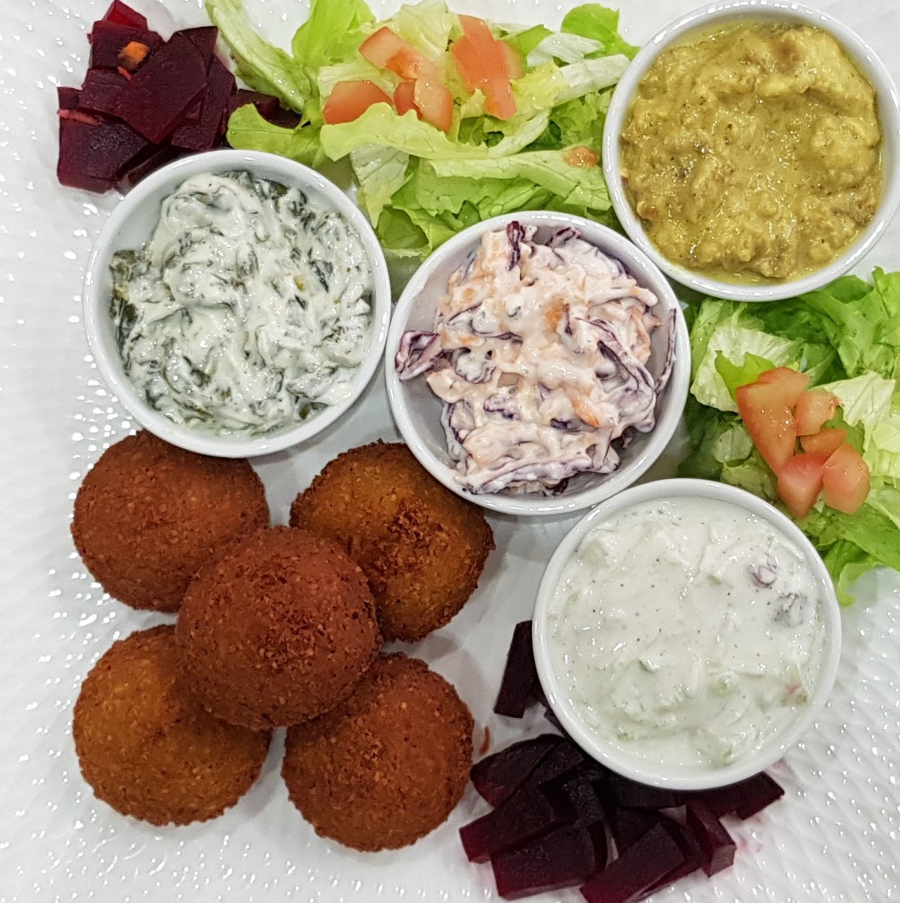 Assiette Goli comme un libanais Avec 4 falafels et mezzes 11€50 Dessert Fereni crème d'amande 3€ Très bon